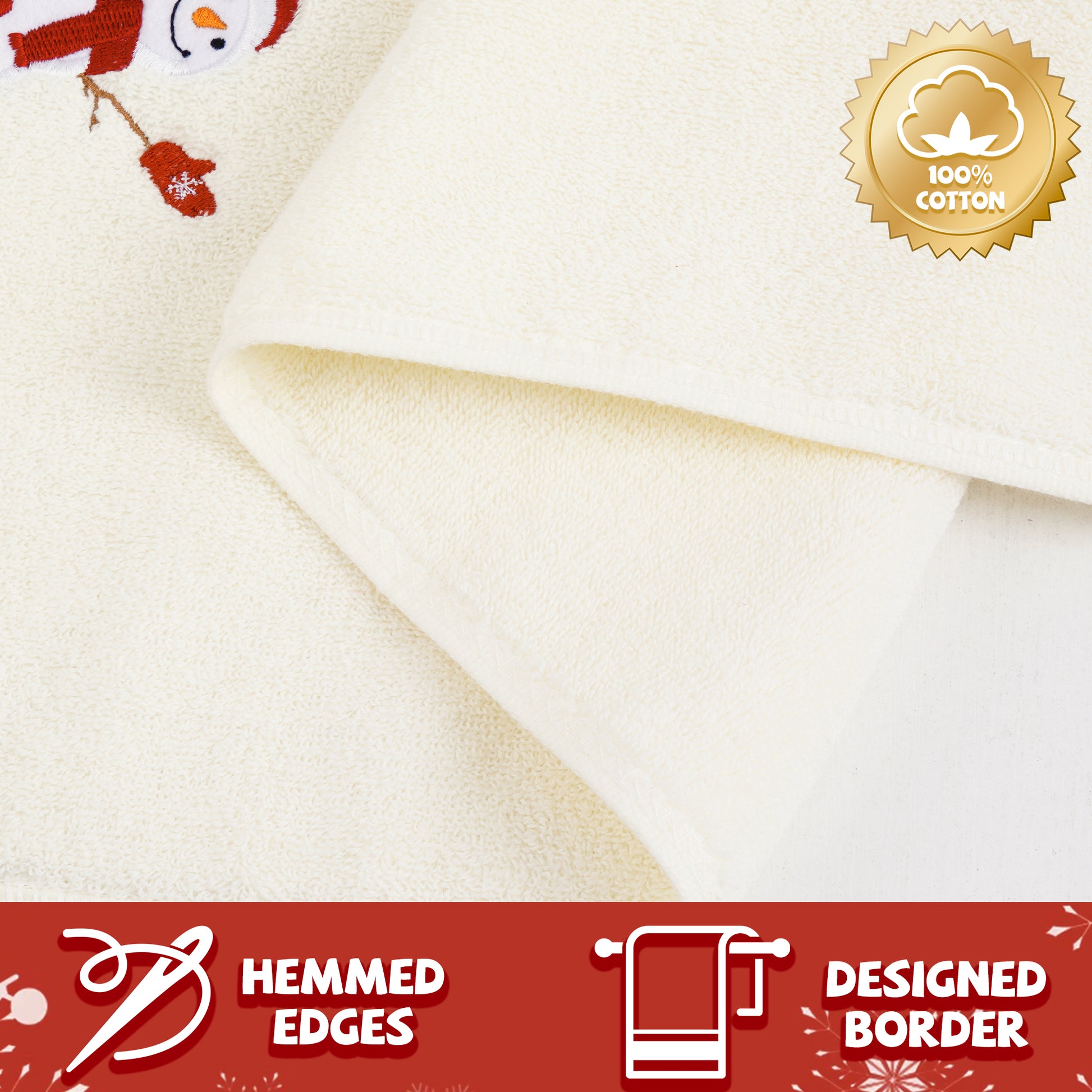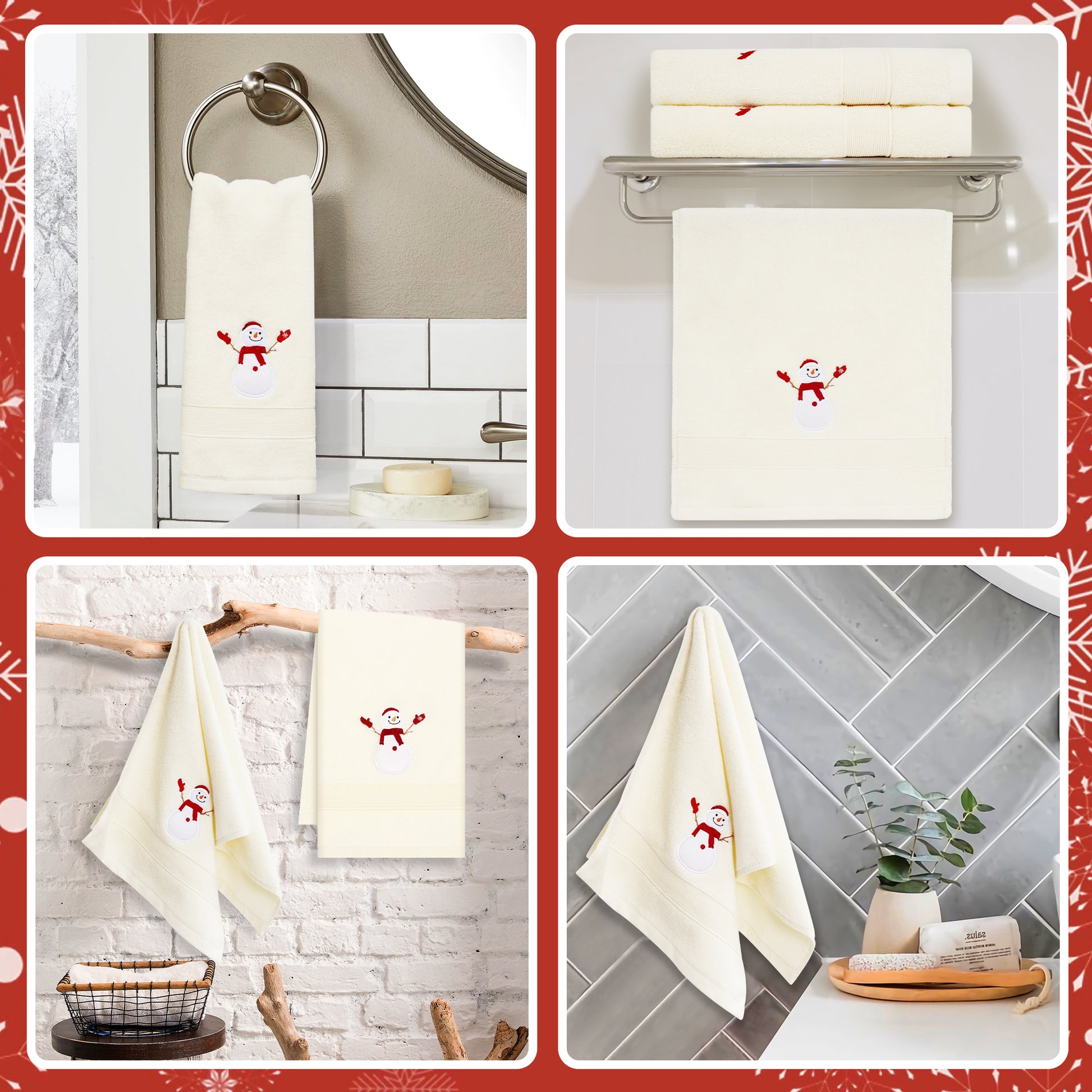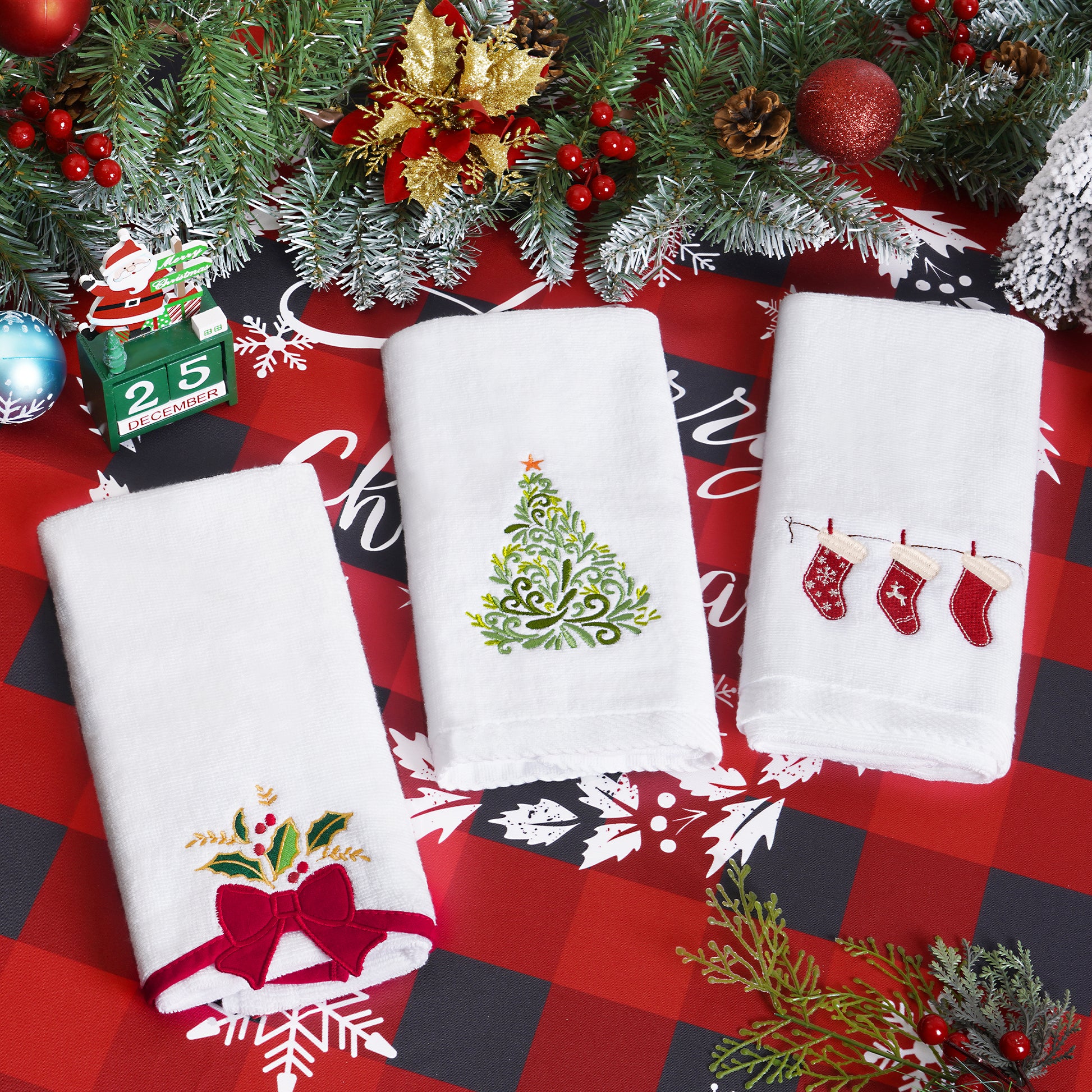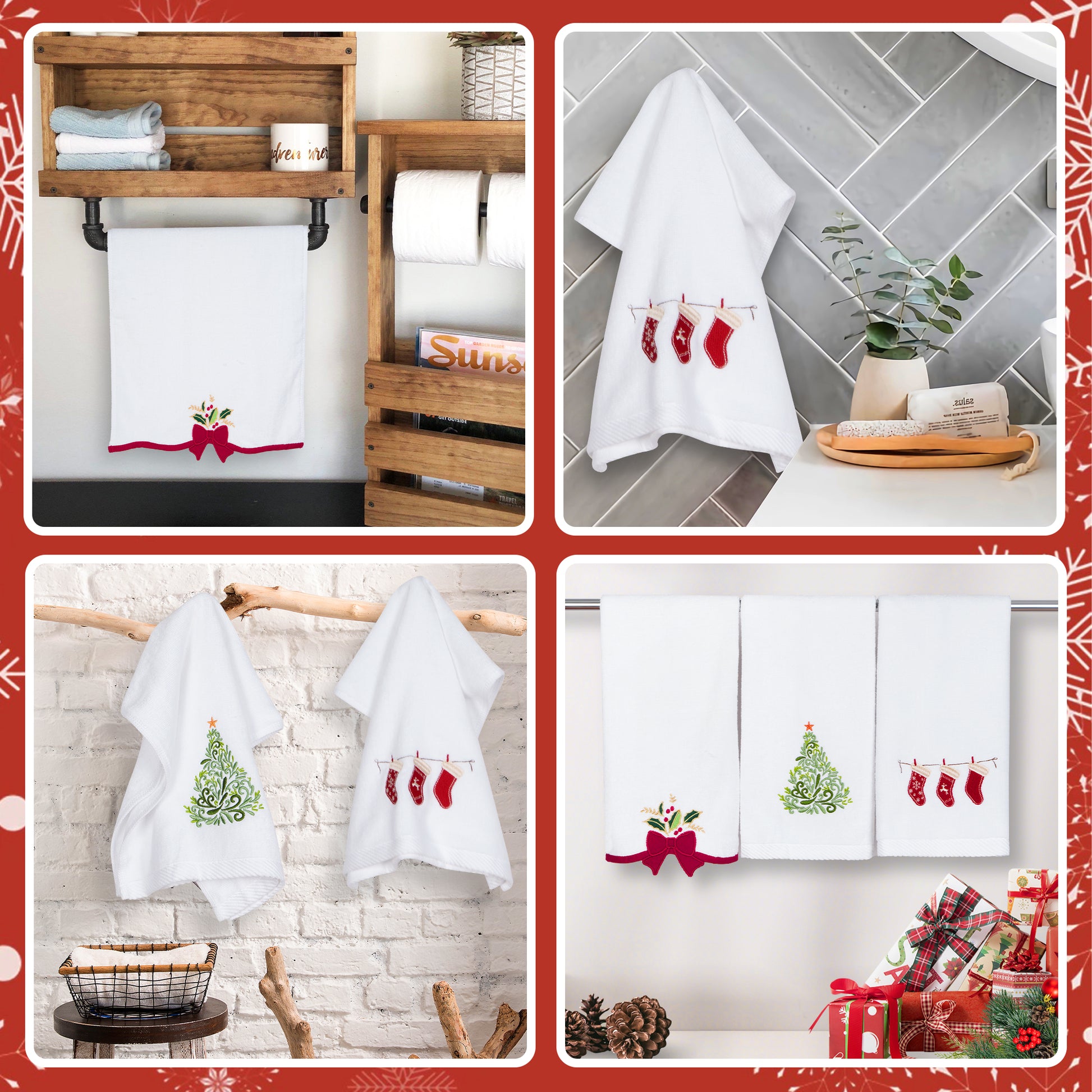 Make everything merry with this 2-piece velour hand towel set featuring seasonal embroidery.